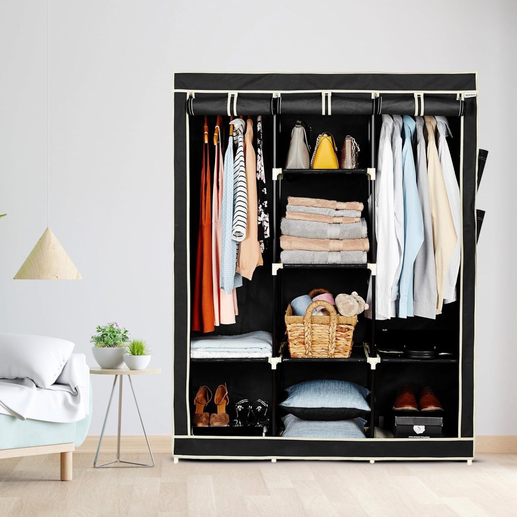 - With Movable clothes hanging rod and 8 storage shelves offers you enough space both for your longer outfits and folded clothes Made from strong and durable material. Powder-coated surface.
