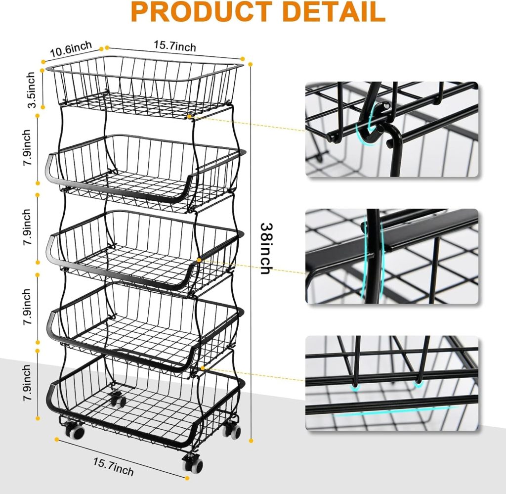 - 【5-Tier Fruit Basket】The fruit vegetable storage cart provide large storage space. A perfect storage solution for kitchen,bedroom, laundry room, playroom. Overall Size: 15.7″ L x 10.6″W x 38″H