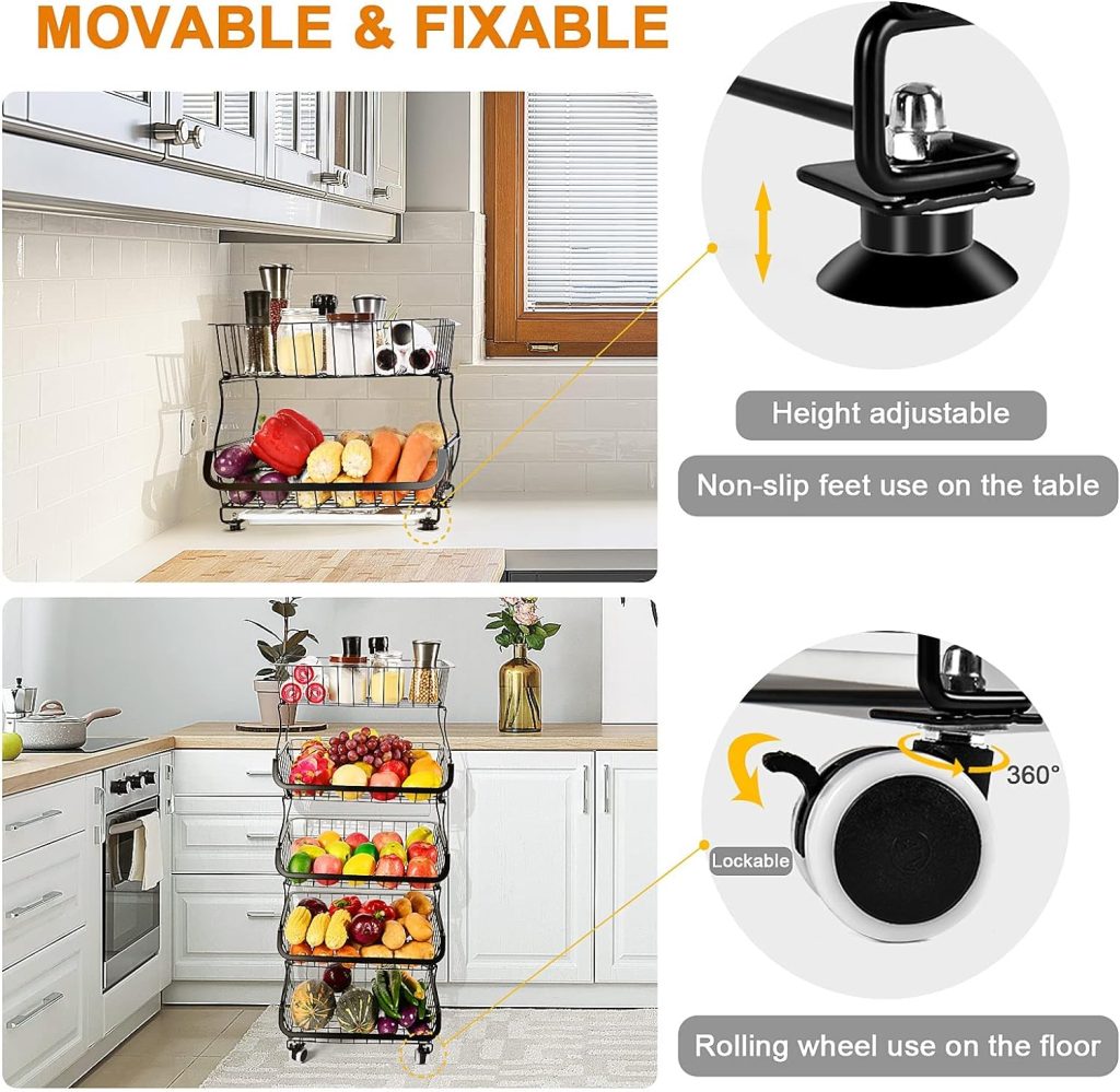 - 【Movable or Fixable】The kitchen storage fruit basket has 4 quality wheels(2 lockable) and 4 non-slip foot mats. 360 degree rotatable wheels help you move this rolling storage basket to wherever you want.