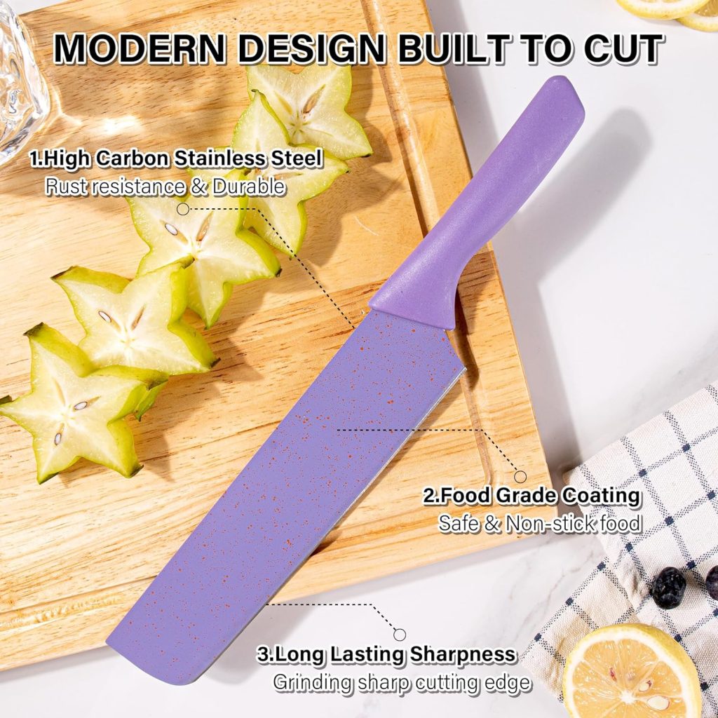 - 【NON-STICK COATING DESIGN】Each knife blade has colorful non-stick coating to match the handle color. The non-stick coating is food-grade and anti-rust, which can prevents the food from sticking on the blade and increases the cutting efficiency. Easy to clean manually, good at extending the service life.