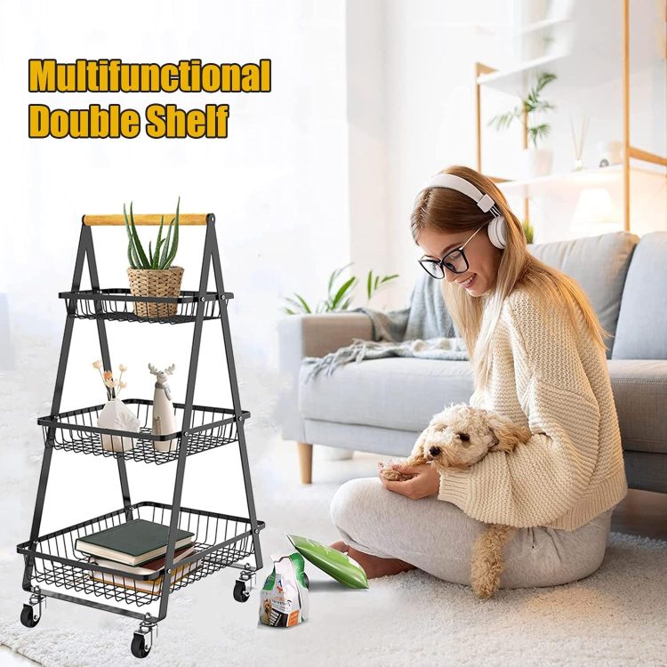- EASY TO MOVE AND SOLID WOOD HANDLE DESIGN: The kitchen rolling fruit basket cart has 4 swivel wheels (2 lockable) and a handle. This makes it easy to roll it wherever you want or place it in a permanent location.
